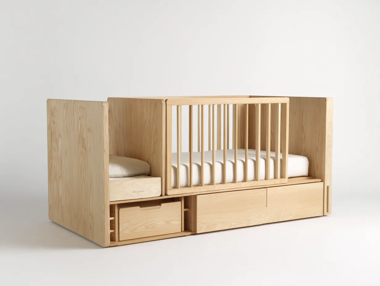 La struttura con sponde verticali crea uno spazio protetto dedicato al riposo del bambino. Il design compatto consente di posizionare la culla facilmente all'interno della cameretta mantenendo una disposizione ordinata dell'ambiente. La base stabile supporta il materasso e contribuisce alla sicurezza generale della struttura.