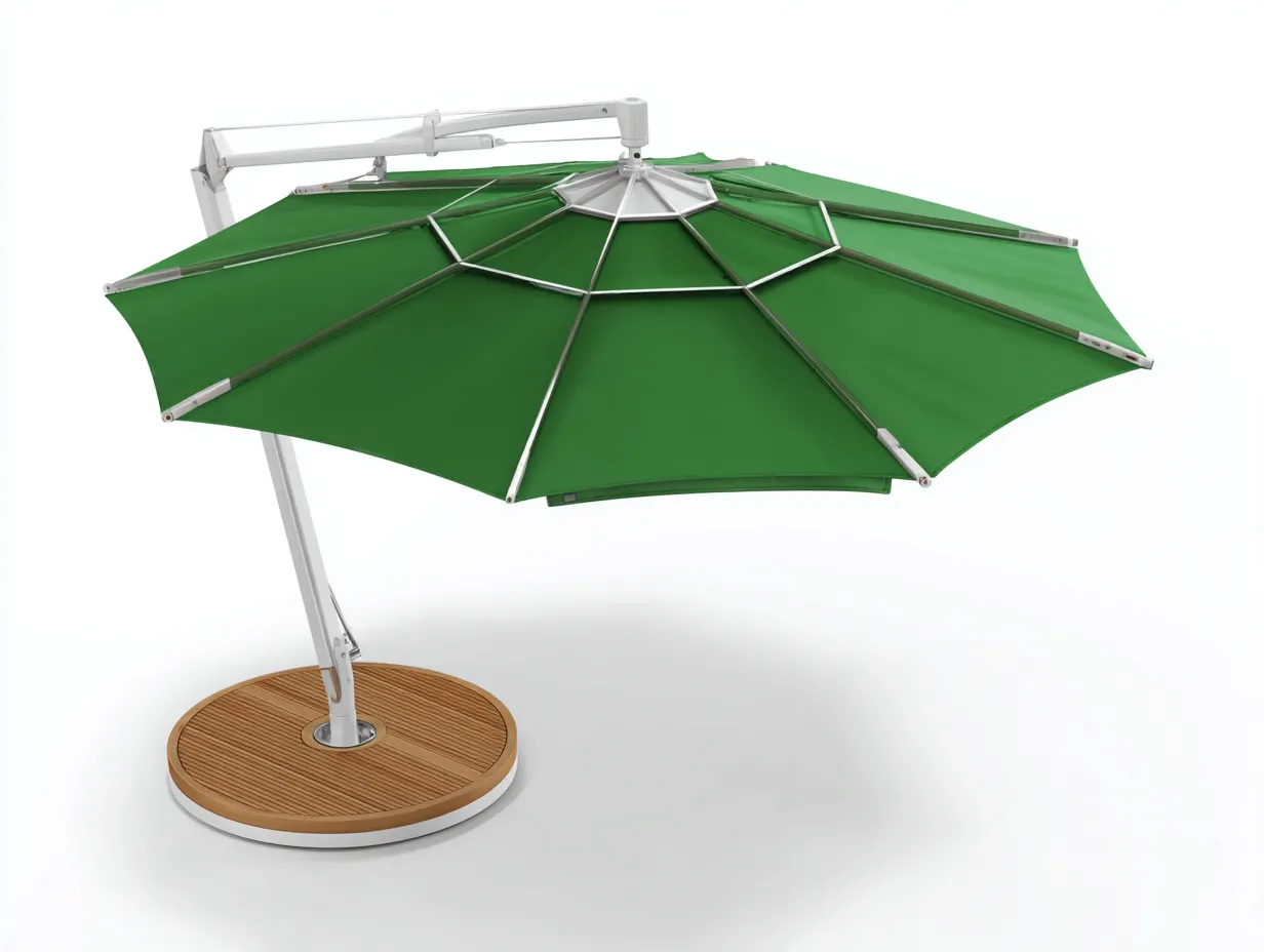 Questo ombrellone da giardino con braccio laterale è progettato per creare una zona d'ombra elegante negli spazi esterni. Il telo verde offre una copertura efficace contro la luce solare mentre la struttura bianca conferisce un aspetto moderno e pulito.