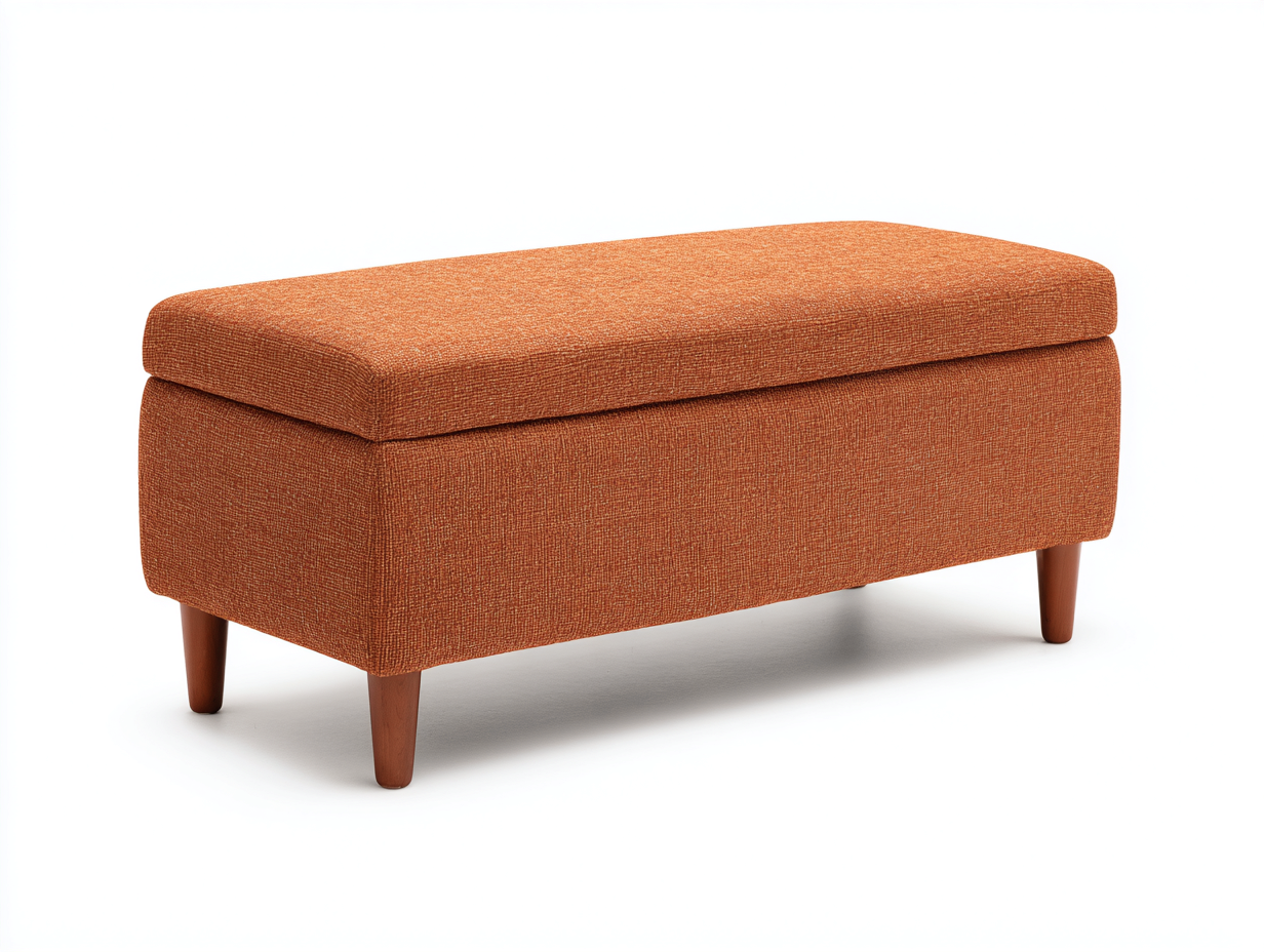 Questa panca imbottita con contenitore integrato è progettata per completare l'arredamento della camera da letto offrendo una seduta confortevole e uno spazio di organizzazione interno. Il rivestimento in tessuto color arancione ruggine crea un contrasto elegante con le gambe in legno scuro.
