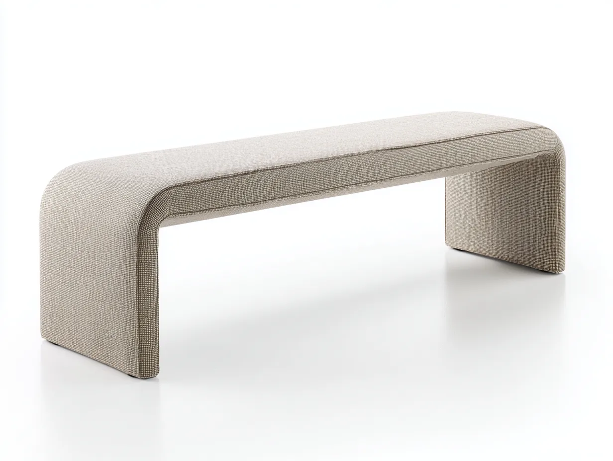 Questa panca imbottita è progettata per offrire una seduta confortevole nella camera da letto. Il rivestimento in tessuto beige e la forma curva creano un aspetto elegante e moderno che si integra facilmente nell'arredamento domestico.